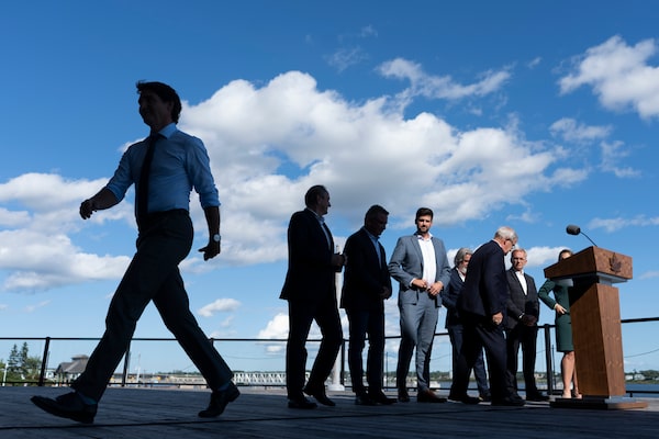 Prime Minister Justin Trudeau, left, walks away following an announcement regarding the federal government's intention to purchase an interim replacement ferry for MV Holiday Island as other MPs look on during a press conference in Charlottetown, P.E.I. on Wednesday, August 23, 2023. THE CANADIAN PRESS/Darren CalabreseDarren Calabrese/The Canadian Press