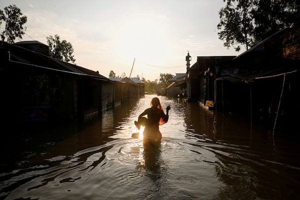 A woman walks on a flooded road in Jamalpur, Bangladesh, July 18, 2020.Mohammad Ponir Hossain/Reuters