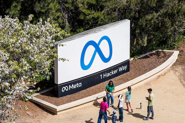 Visitors gather at a sign outside Meta headquarters in Menlo Park, Calif.Noah Berger/The Associated Press