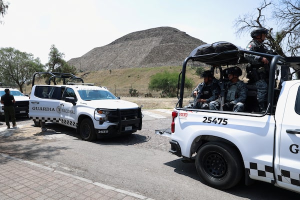 Members of the Mexican National Guard posted at the perimeter of the Teotihuacán pyramids on the outskirts of Mexico City, where a gunman killed a Canadian woman and wounded several others on Monday.Luis Cortes/Reuters