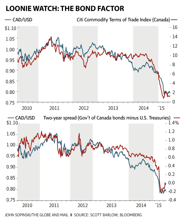 The surprise is that the relative yield of Canadian bonds appears to be an equally powerful force in determining the exchange rate for the loonie. The lower chart compares the loonie with the difference in yields between two-year Government of Canada bonds and U.S. Treasuries.