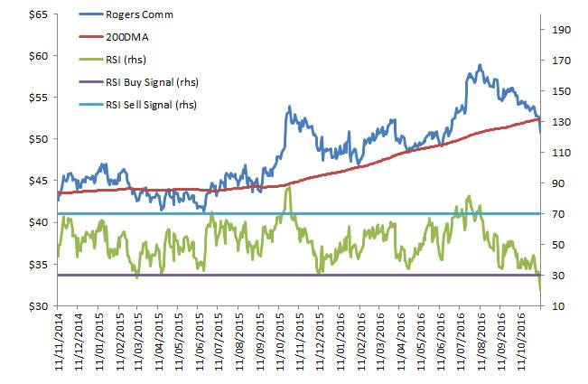 I picked Rogers Communications Inc. for the focus stock primarily because it's more oversold than at any time in the past two years. There is, however, a problem – the recent sell-off has pushed the stock well below the 200-day moving average trendline. This could signal a sustained downturn.