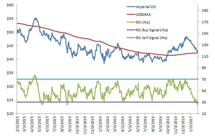 In Imperial Oil's case, however, I noticed something potentially useful in that the stock appears very sensitive to its 200-day moving average. At $42.86, the price is exactly at the 200-day at this point.