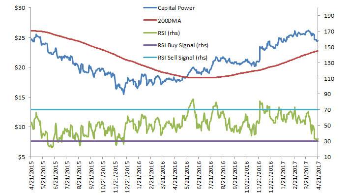 Before now, Capital Power has not been oversold when the price was above the trend line. Investors can hold some hope that the stock will bounce because it remains above the 200-day, but there's not enough previous buy signals during the period to be really confident it. Capital Power's strong indicated dividend yield of xx per cent should help, but I don't think the stock warrants buying on technical grounds alone.