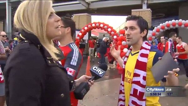 CityNews reporter Shauna Hunt interviews a soccer fan in Toronto on May 10, 2015, in this video frame grab.Share