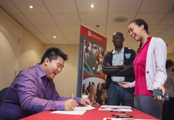 Leah Junor and her father Tony Junor register with Vince Kang, a peer mentor from the University of Ottawa, before an event for incoming students from the Toronto area in Mississauga.JENNIFER ROBERTS/The Globe and Mail