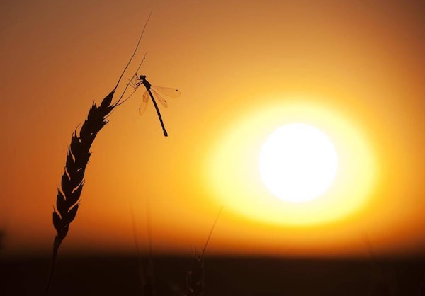 A dragonfly lands on a stalk of wheat ready for harvest during sunset on the Canadian prairies near Vulcan, Alta.TODD KOROL/Reuters