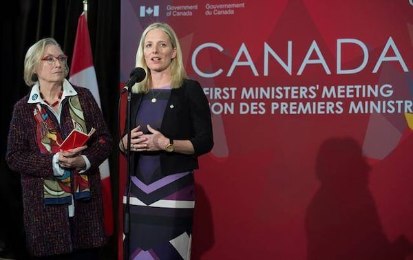 Indigenous and Northern Affairs Minister Carolyn Bennett looks on as Minister of Environment and Climate Change Catherine McKenna, right, responds to a question during a media availability at the First Ministers' Meeting in Ottawa, Friday, December 9, 2016. THE CANADIAN PRESS/Adrian WyldThe Canadian Press