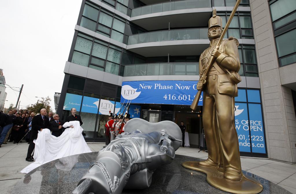 In Douglas Coupland’s playful work at Bathurst Street And Lake Shore Boulevard, the standing soldier wears the uniform of the Royal Newfoundland Regiment and the lying soldier the uniform of the 16th United States Infantry Regiment.