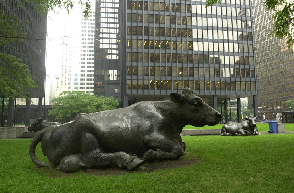 Seven bronze cows by Saskatchewan-born Joseph Fafard lounge in the shadow of the TD Centre. When they were unveiled in 1985, Globe and Mail critic John Bentley Mays said they set off the severe lines of Ludwig Mies van der Rohe's dark towers and recalled “the pastoral history of the site with a playful vengeance.”