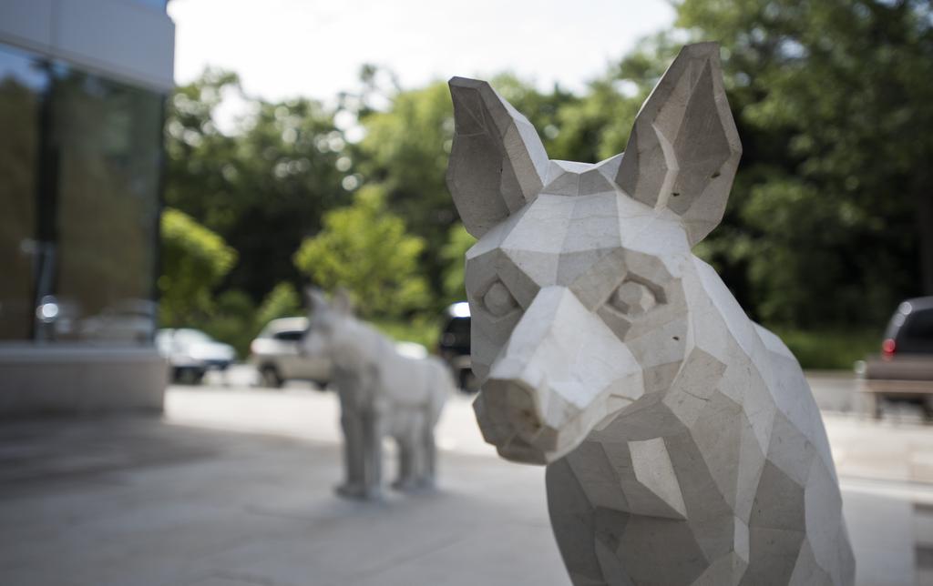 Stone coyotes stand in a square in front of a High Park condo in this work by Elle Flanders and Tamira Sawatzky of Public Studio. The animals face an LED screen that shows a changing landscape made with digital gaming software.