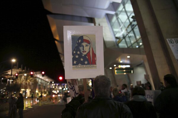 Protesters chant during a rally against Trump’s immigration order at San Diego International Airport on March 6, 2017.SANDY HUFFAKER/AFP / Getty Images
