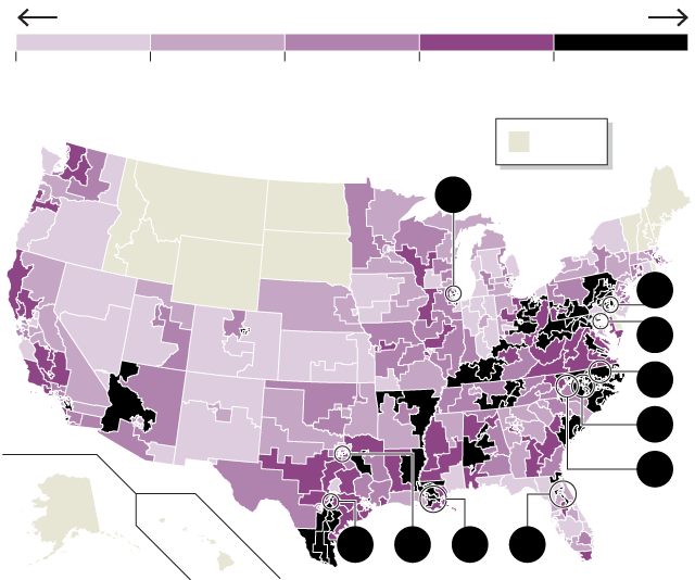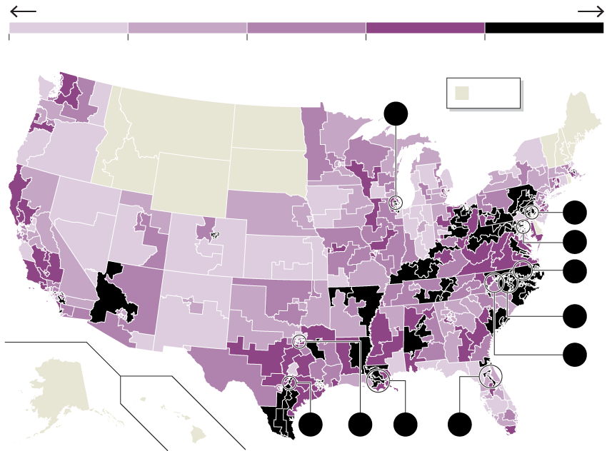 Creative map-drawing can widen racial divides, too. Many oddly shaped districts sprang from civil-rights legislation designed to increase black representation in the halls of power. Their boundaries reach this way and that to gather in African-American voters and create so-called majority-minority districts that tend to elect black representatives, usually Democratic. The effect, though, is to bleach surrounding districts white. That suits Republicans, because those districts often tend to vote for them. The result has been what was once called an unholy alliance between white Republicans and black Democrats.