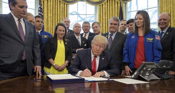 President Donald Trump signs the NASA Transition Authorization Act of 2017 in the Oval Office on March 21, 2017.Bill Ingalls/NASA/Getty Images
