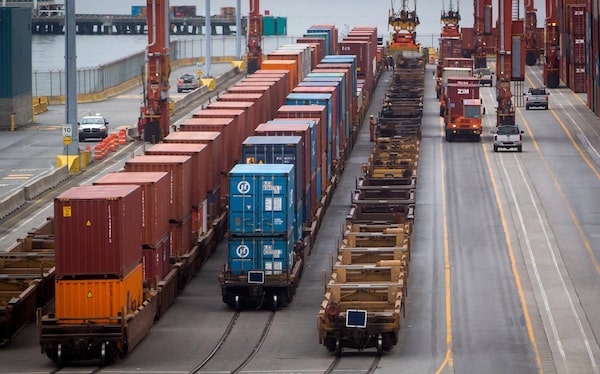 Workers stand by as cargo containers are removed from train cars at the DP World Container Terminal at Port Metro Vancouver, in Vancouver, B.C.DARRYL DYCK/The Globe and Mail