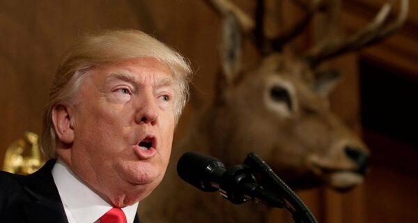 Under a mounted deer, U.S. President Donald Trump speaks before signing the Antiquities Executive Order at the Department of the Interior in Washington, DC, U.S. April 26, 2017.KEVIN LAMARQUE/Reuters
