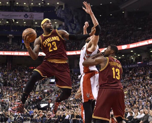 Cleveland Cavaliers' LeBron James (23) drives to the basket as Toronto Raptors' Jonas Valanciunas defends during second half NBA basketball action in Toronto on Wednesday, March 4, 2015.Frank Gunn/The Canadian Press