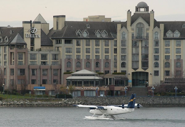A West Coast Air float plane taxis across the Inner Harbour in front of the Delta Victoria Ocean Pointe hotel in Victoria, BC.DON DENTON