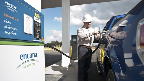 An employee filling up his natural gas truck at <strong>Encana</strong>'s new compressed natural gas (CNG) fueling station in Louisianas Red River Parish, which was opened on November 30, 2010