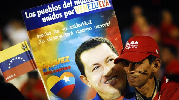 A supporter of Venezuela's President Hugo Chavez holds a poster with a photograph of Chavez and the words "The peoples of the world, united through Venezuela, thank you for your solidarity. Your victory will be ours" while standing on a square in San Salvador, El Salvador, March 5, 2013.Ulises Rodriguez/Reuters