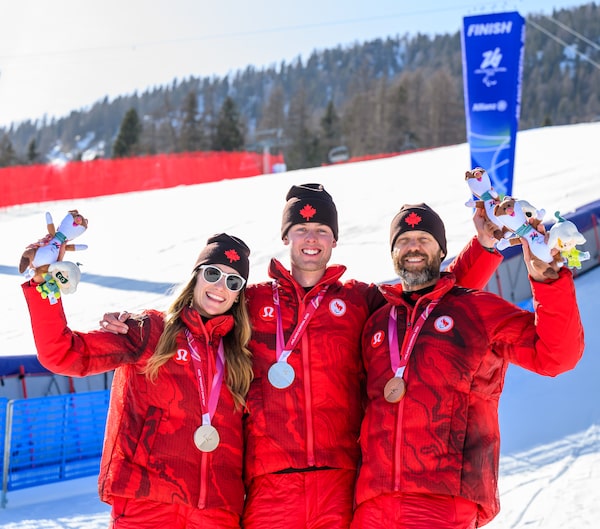 Kurt Oatway, Kalle Eriksson and Sierra Smith pose with their medals at the 2026 Paralympic Games in Cortina, Italy on Saturday.Angela Burger/The Canadian Press