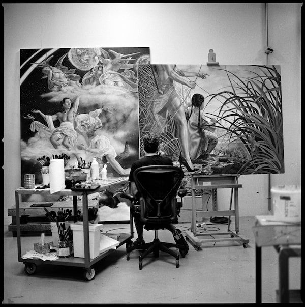 Monkman points to a tiny misshapen star on a large painting of the cosmos. One of his deputies tears off a piece of green masking tape and sticks it to the wonky star. It will have to be touched up. But not necessarily by Monkman himself. He entrusts a handful of painters – assembled from social media and Canada’s top art schools – to help him complete his work. It’s a practice that harks back to the Renaissance and has been embraced by contemporaries such as Jeff Koons and Ai Weiwei. (Though it’s not without its detractors.)