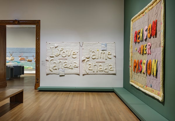 Yet Wieland was fully capable of irony. Her best-known quilt, featuring Trudeau’s famous political philosophy, is not a simplistic embrace of Trudeaumania. With soft shapes and pretty colours, the 1968 piece (on loan from the National Gallery) suggests that one might just as easily argue for passion over reason. (The show’s catalogue cites Wieland saying she believed the two should go side by side.)