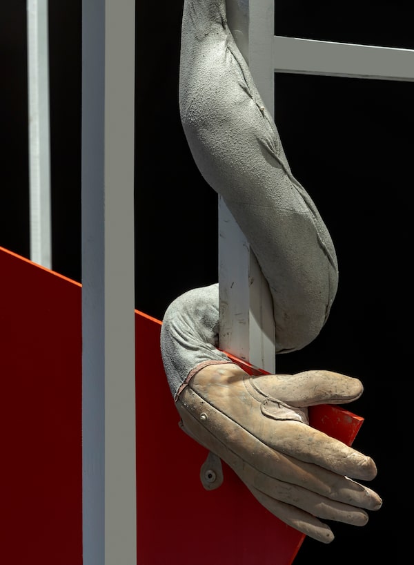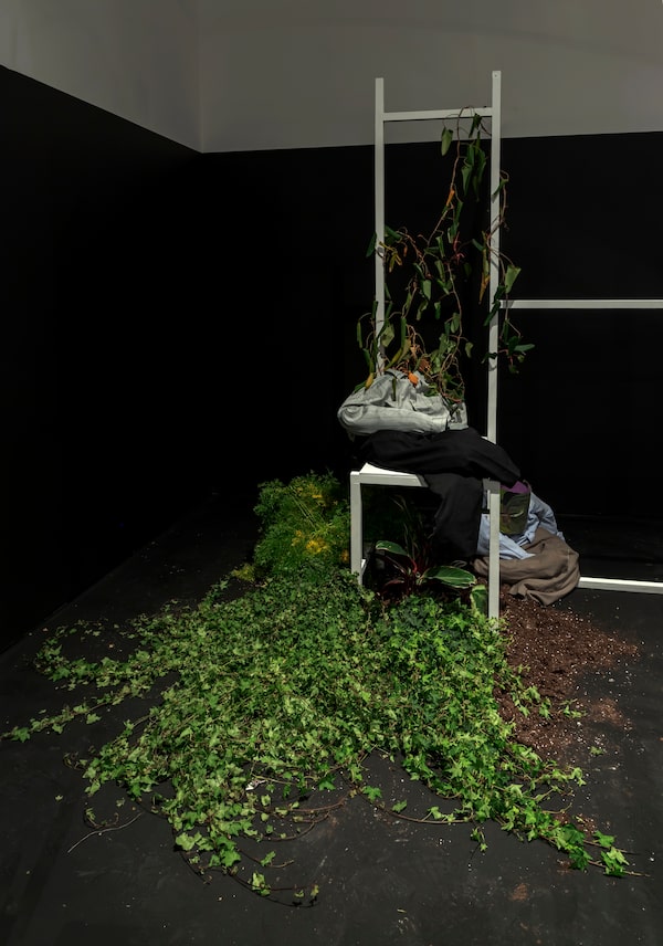One created by the French visual artist Laure Prouvost, the engineer of surreal spaces where disembodied humans co-exist with animals and objects in some elusive future state. At last year’s Venice Biennale, there were hours-long lineups to see Deep See Blue Surrounding You, her transformation of the French pavilion into a watery and ramshackle cinema. There, visitors watched a dream-like video in which a troupe of cultural pilgrims travel to the art exhibition itself; that travelogue also evoked the migrant crisis, while the installation around it included an antique globe, a discarded cellphone and tossed cigarette butts, as well as a live dove and that signature octopus, a creature known for its intelligence. The work hinted at a world where humans surrender their idiocy … and their primacy. Now, for this smaller Toronto installation, entitled Obscure Union, Prouvost’s collaborator Jonas Staal makes the politics of these juxtapositions more explicit.