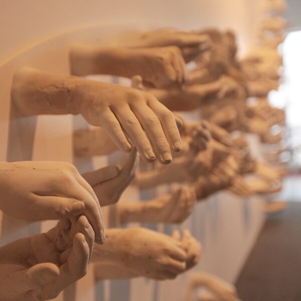 One-hundred-and-seventy-eight cement hands are reaching out of a white wall. Above them are photos of children and, written in black type, a series of questions. “Whose stories remain silent, and whose are forcibly told?” asks one. And another: “What stories hide themselves at the outer layer of the picture frame or under the innocence of these children’s precious faces?”