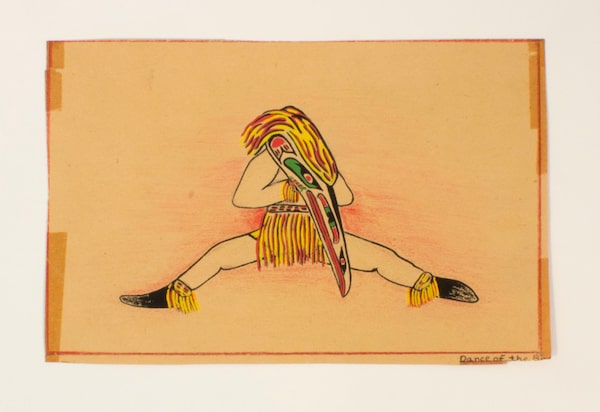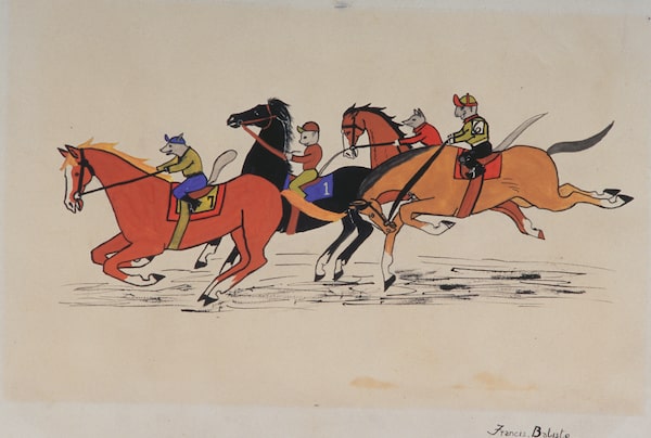 The final section features work by students of another kind teacher, Robert Aller. Aller was inspired by his own teacher, Group of Seven co-founder Arthur Lismer, who advocated for children’s art education. Aller brought those beliefs to the Alberni Indian Residential School in Port Alberni, B.C., and the MacKay Indian Residential School in his hometown of Dauphin, Man., where he led extracurricular art classes. Unlike so many others who were put in charge of these children, Aller – working in the late 1950s and early 60s – appreciated the Indigenous cultural experiences the system was working to crush. As a result, many of the paintings his students made recreated memories from home: family members, fishing trips, an isolated beach.