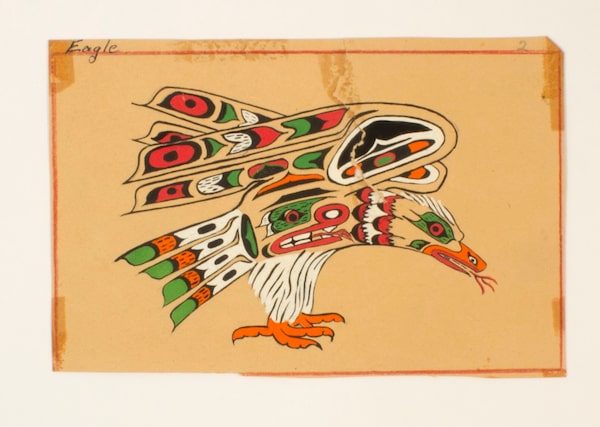 The second section features work made at the St. Michael’s Indian Residential and Day School in Alert Bay, created between 1940 and 1969. The works here are more regimented – based on traditional depictions of creatures such as the eagle, killer whale and raven.