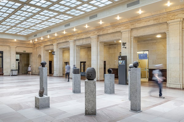 In Threat Return of 2023, Alaskan artist Nicholas Galanin mounts bronze masks on museum plinths in Union Station's west concourse, in a comment on repatriation of Indigenous art.TONI HAFKENSCHEID/Toronto Biennial of Art