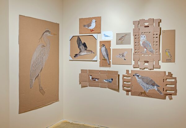 Threatened (Birds in Canada) of 2024 by Montreal artist Maria Ezcurra features drawings on discarded cardboard packaging.TONI HAFKENSCHEID/Toronto Biennial of Art