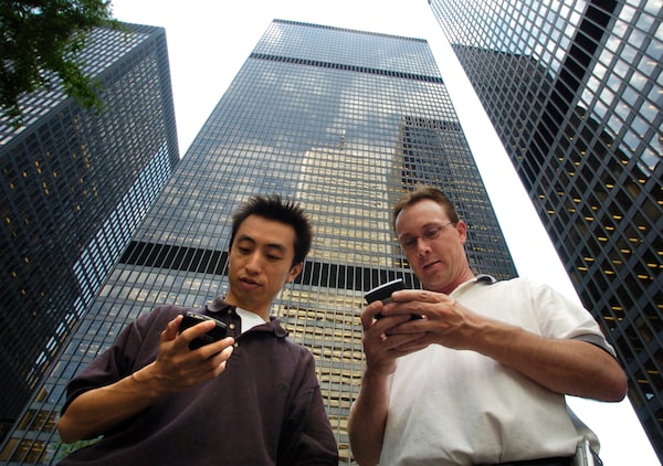 Eric Takounlao, left, and Ken Stevenson, IT workers in the TD Centre Tower, in Toronto on July 22, 2005, after a bomb threat forced people out of the building. They each use their BlackBerry to relay information about what transpired at the office tower.Fred Lum/The Globe and Mail