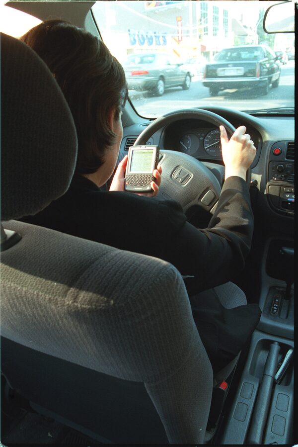Globe and Mail freelancer reporter Kira Vermond is photographed with her Blackberry pager on Sept. 7, 2001. Vermond is checking her e-mail messages in traffic.John Hryniuk