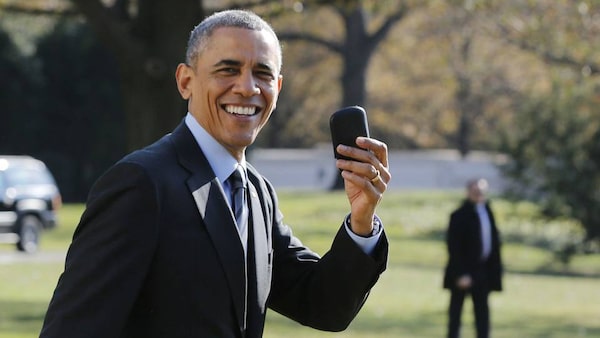 Noted BlackBerry fan and then-U.S. President Barack Obama holds up his BlackBerry device upon returning inside the White House to retrieve it, after boarding Marine One on the South Lawn of the White House in November, 2014.LARRY DOWNING/Reuters