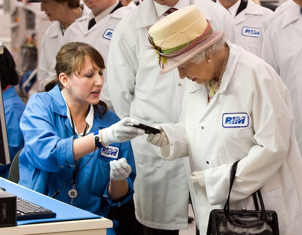 Queen Elizabeth is shown a new BlackBerry by electronics assembler Elvira Dulic as she tours Research in Motion in Waterloo, Ont. on July 5, 2010.FRANK GUNN/The Canadian Press