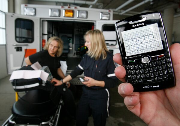 In 2007, The Globe and Mail's André Picard wrote about the BlackBerry changing health care. Paramedic Carolyn Cook (not shown) holds a BlackBerry containing an EKG sent from an ambulance, similar to the one used to save the life of heart attack victim Brian Doener, left, who speaks with Christina Morrow, centre right, at St. Mary's General Hospital in Kitchener, Ont., on Feb. 4, 2008. The transmission of EKG data directly from the ambulance to a BlackBerry-equipped cardiologist at the hospital allowed the patient to bypass the ER and head directly into a cardiac care suite, saving ER resources and precious minutes for the patient.J.P. MOCZULSKI/The Globe and Mail