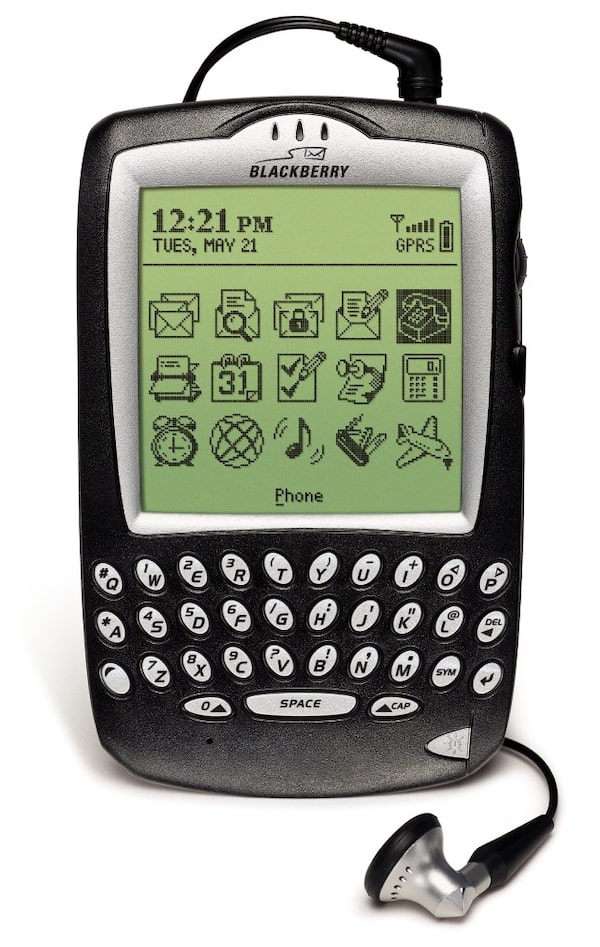 The BlackBerry Wireless Handheld 957, released in 2000. A review on cnet.ca said the device was 'strictly business. It functions as a mobile version of Microsoft Outlook, and that's it. There are no colors, games, or any other frills. But for busy executives who need to be connected to e-mail all the time, it does the trick.'NYT/The Associated Press