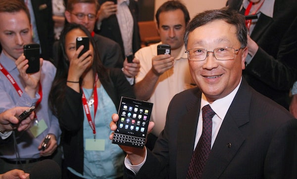 BlackBerry CEO John Chen shows off the Passport phone after the company's annual general meeting in Waterloo, Ont., June 19, 2014.Dave Chidley/The Canadian Press