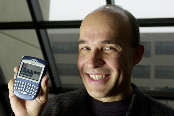 Mark Guibert, then-vice president of brand management at RIM in Waterloo, holds the BlackBerry 5810, on March 12, 2002.Lisa Malleck/The Globe and Mail