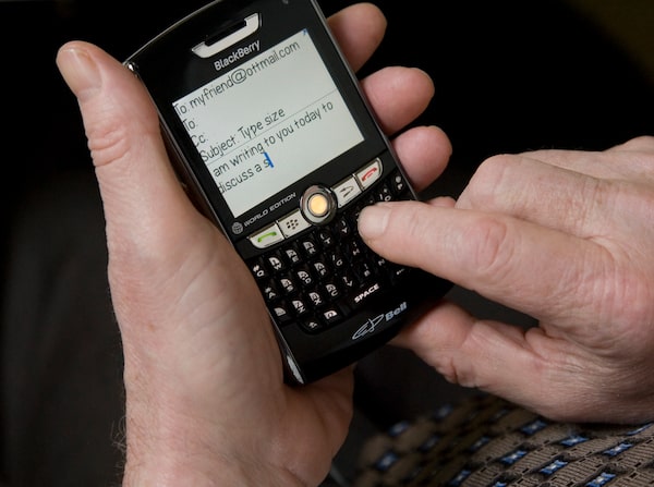This photo accompanied a story about how people from older generations type on a Blackberry with index fingers, and not their thumbs.Peter Power/The Globe and Mail