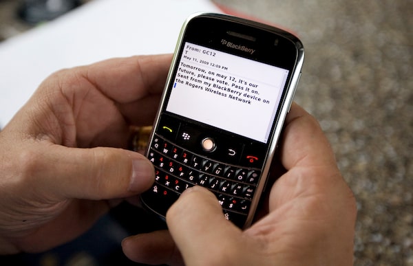 Liberal Leader Gordon Campbell shows a message that he has sent out on his BlackBerry while on his campaign bus in Vancouver, May 11, 2009. Campbell asked British Columbians to e-mail, text, use Facebook or Twitter in a effort to get more people out to vote in the province's election.JONATHAN HAYWARD/The Canadian Press