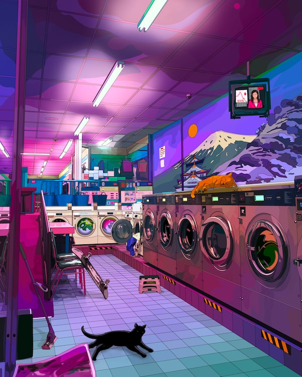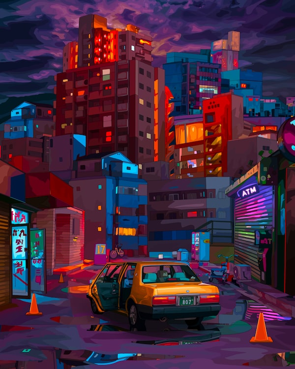 You can detect a stylistic influence from those early stained glass windows on Dowbak’s crypto art: the bright colours, the line work. The subject matter, however, is another thing. His work, as described by Nifty Gateway, is “a cyberpunk rendition of metropolitan lifestyle rooted in nature.” A black cat lounges in a laundromat as laundry spins in one of the machines and breaking news scrolls by on the television above. Or a taxi is stuck in a storm, its doors flung open as its hazard lights flash, along with lightning in a purple sky.