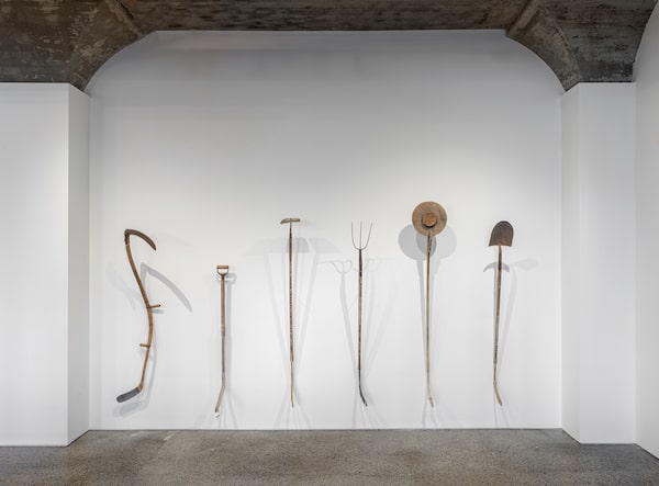 Oluseye's Ploughing Liberty features a series of old wooden hockey sticks and affixes them seamlessly to antique farm implements evocative of early Black Loyalist farmers, in a statement on how Canadian identity has been narrowly crafted.Toni Hafkenscheid/Courtesy Patel Brown Gallery