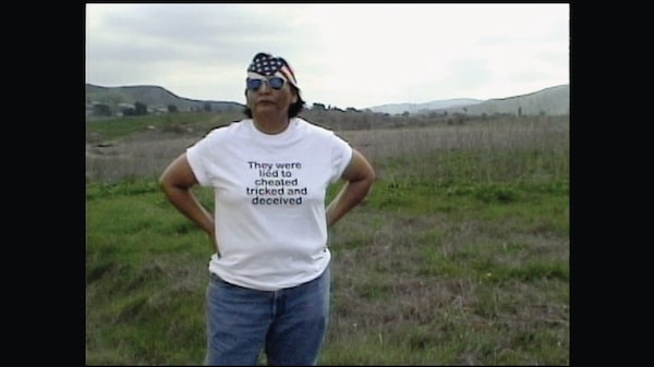 Niro is often a witty artist; she is rarely a subtle one. Take, for example, The Shirt of 2003, a series of large-scale photographs showing Navajo photographer and scholar Hulleah Tsinhnahjinnie wearing a series of white T-shirts with a text recounting the history of colonialism in the bluntest terms: “My ancestors were annihilated, exterminated, murdered and massacred … and all’s I get is this shirt.” Spoiler alert: In the penultimate image Tsinhnahjinnie is shirtless and in the final image a white woman is now wearing that last T-shirt.