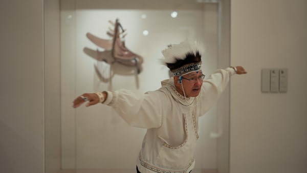 Ossie Kairaiuak of the musical group Pamyua dances a mask carved by Yup’ik artist Drew Michael.Glauco Bermudez/Rezolution Pictures Inc./Supplied
