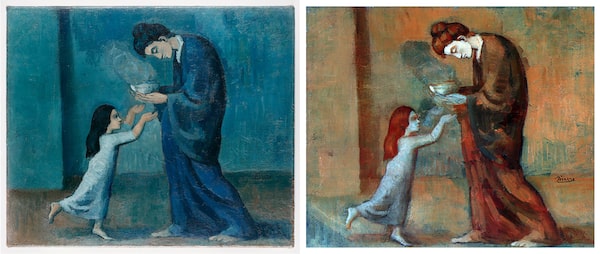 Testing The Soup, a small 1903 painting in the AGO collection showing a bowed woman offering a bowl to a child, the researchers discovered how Picasso gradually simplified the composition to these two timeless figures. The painting may have originally featured a second child, or people eating at a table, in a less stylized image of poverty.