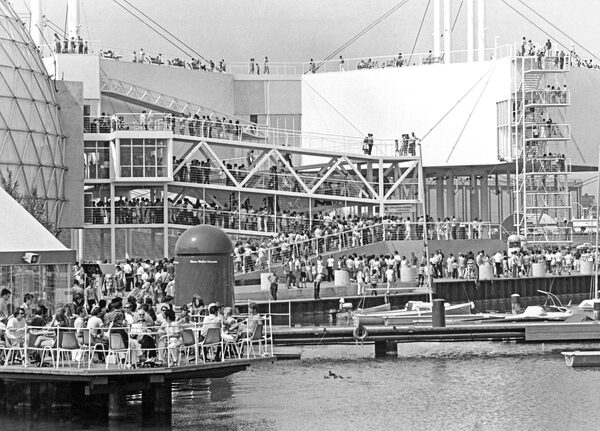 Visitors crowd ramps and walkways as Ontario Place reached its halfway point in season, August 2, 1971.BARRIE DAVIS