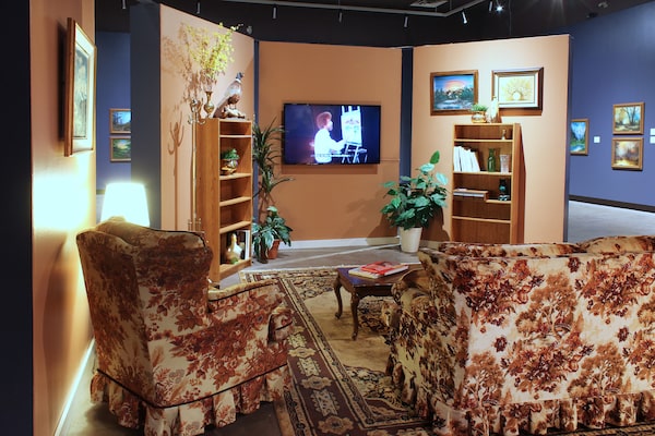At the centre of the exhibition is an area set up to look like a 1980s TV room – loud patterned couch, clashing rug and other era-appropriate furnishings (borrowed from Habitat for Humanity) – with Bob Ross being broadcast from the very contemporary flat-screen.